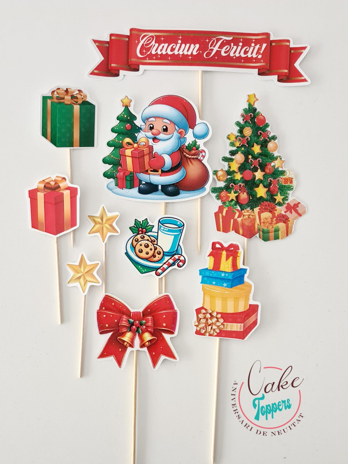 Set toppere craciun personalizat. Dimensiunile sunt aproximativ ntre 5 si 12 cm de bucata personj.Topperele sunt printate laser pe carton lucios de 300mg, spatele lor fiind alb. Vin montate pe bețe din lemn/bambus si decupate perfect mecanic.