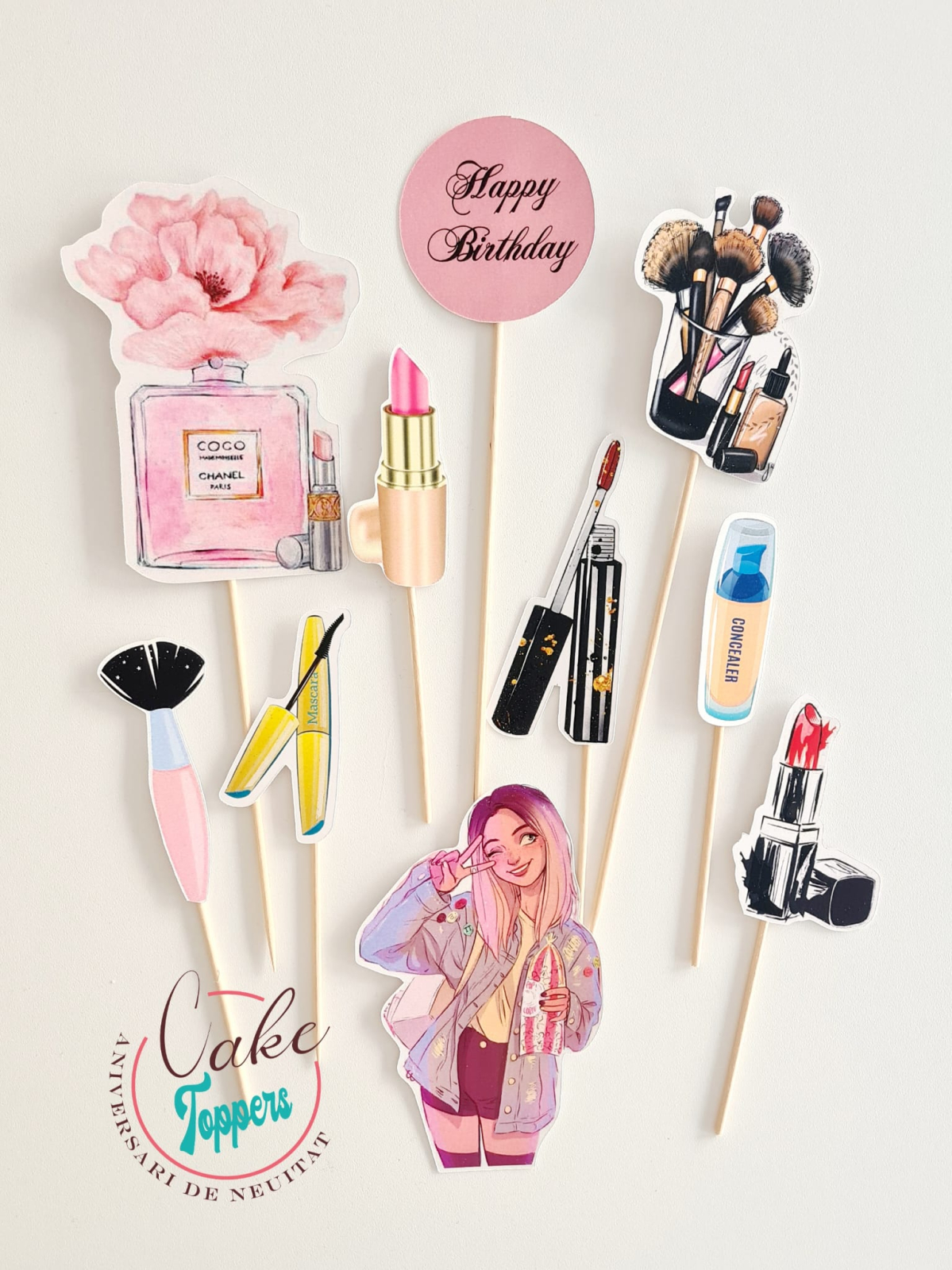 Set toppere tort Make up girl. Dimensiunile sunt aproximativ intre 5 si 12 cm de bucata personj.Topperele sunt printate laser pe carton lucios de 300mg, spatele lor fiind alb. Vin montate pe bețe din lemn/bambus si decupate perfect mecanic.