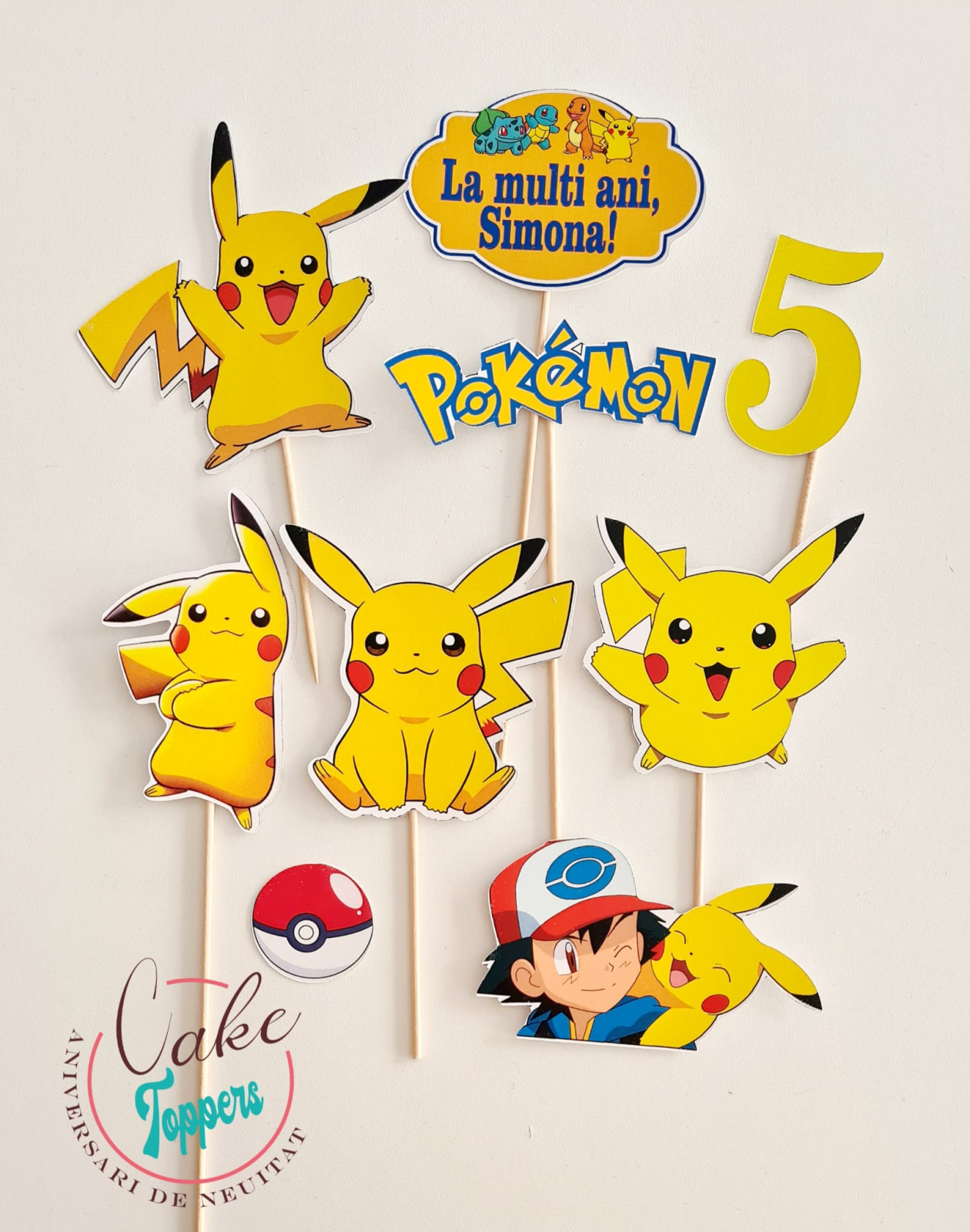 Set toppere Pikachu personalizat. Dimensiunile sunt aproximativ intre 5 si 12 cm de bucata personj.Topperele sunt printate laser pe carton lucios de 300mg, spatele lor fiind alb. Vin montate pe bețe din lemn/bambus si decupate perfect mecanic.