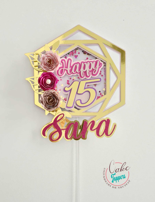 Topper cu flori 3D pentru fete personalizat pentru tort, cu design spectaculos și efect premium.