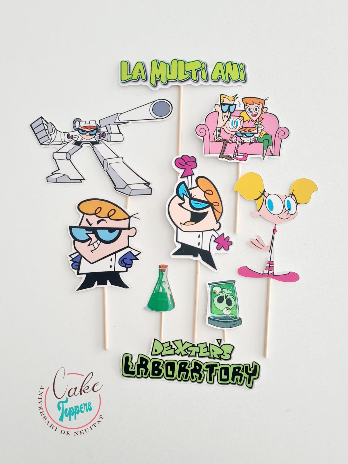 Set toppere Dexter cu mesaj. Dimensiunile sunt aproximativ ntre 5 si 12 cm de bucata personj. Topperele sunt printate laser pe carton lucios de 300mg, spatele lor fiind alb. Vin montate pe bețe din lemn/bambus si decupate perfect mecanic.