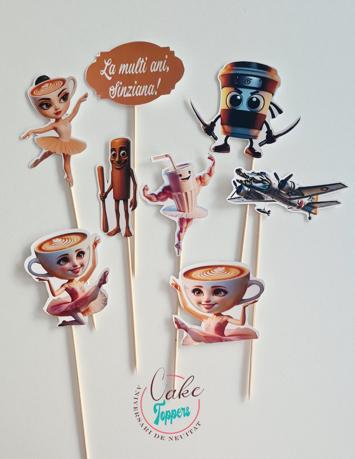 Set toppere personaje Ballerina Cappuccina cu mesaj. Dimensiunile sunt aproximativ ntre 5 si 12 cm de bucata personj. Topperele sunt printate laser pe carton lucios de 300mg, spatele lor fiind alb. Vin montate pe bețe din lemn/bambus si decupate perfect mecanic.
